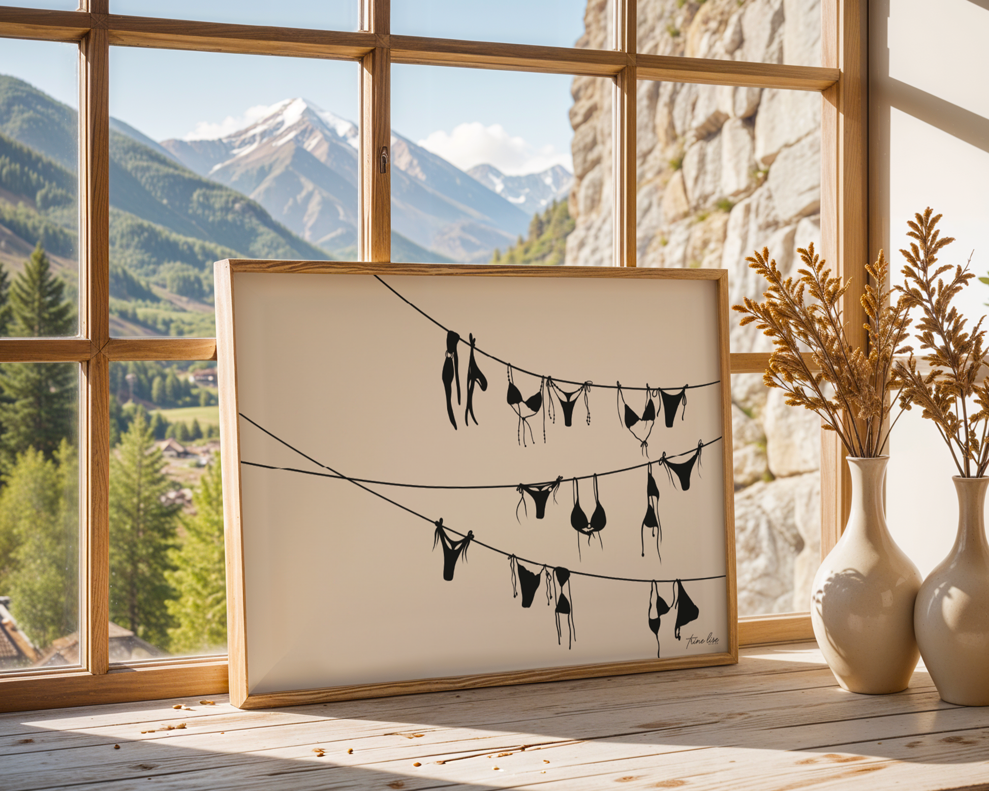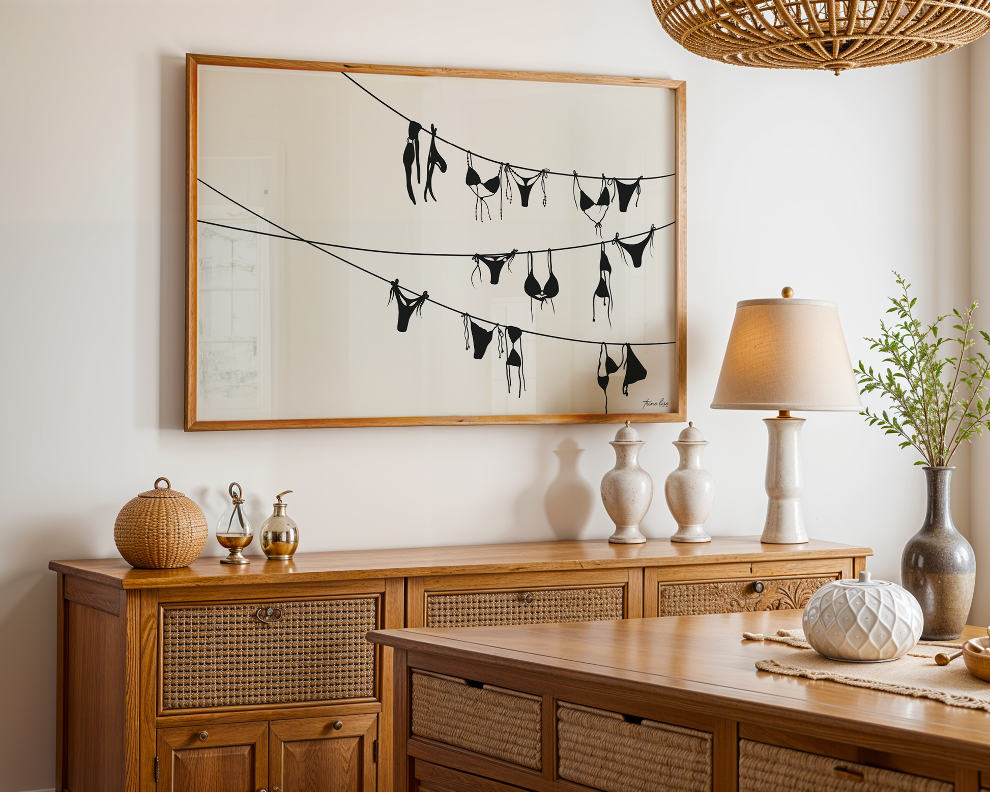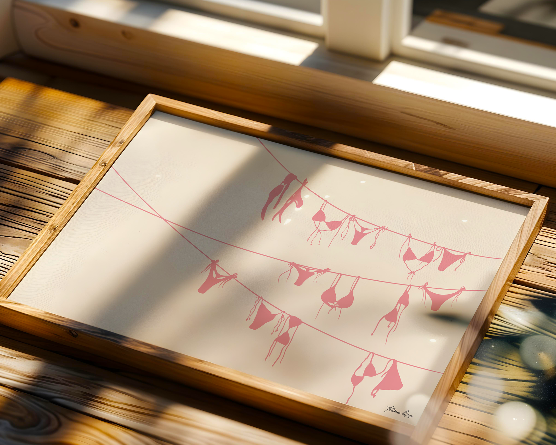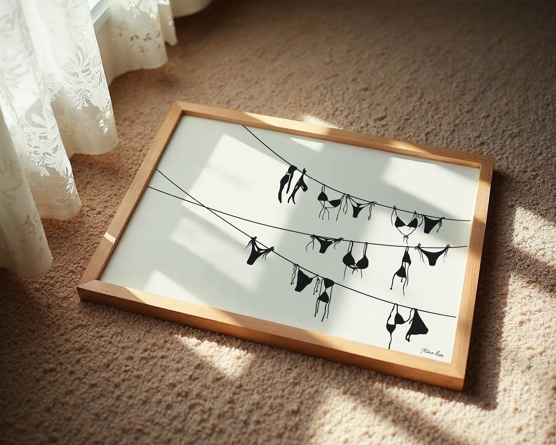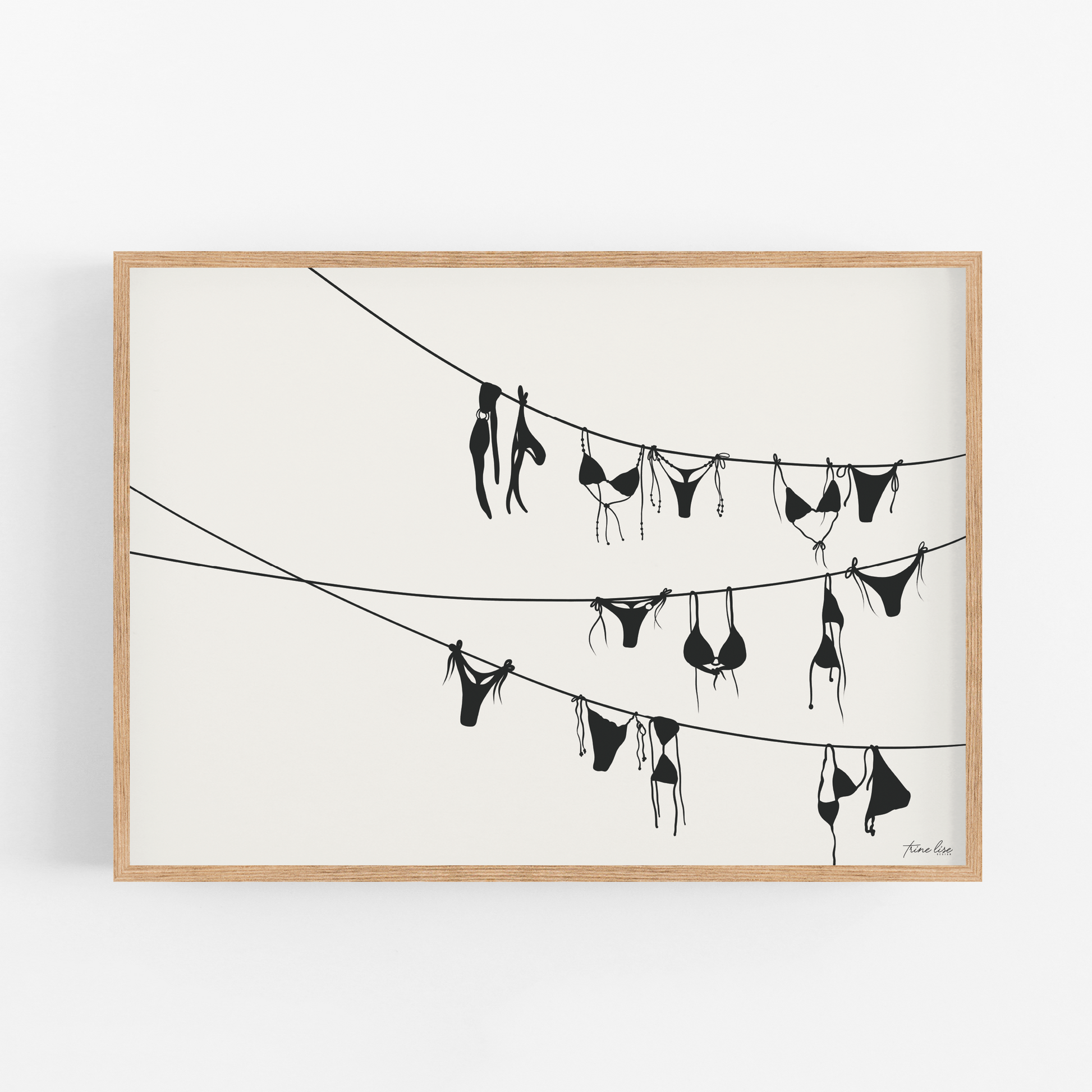 Bikini er inspirert av ferie og syden. Illustrasjon av en tørkesnor med mange bikinier med en lys beige bakgrunn. Denne plakaten fungerer godt på veggen hele året rundt og finnes i to ulike farge varianter.