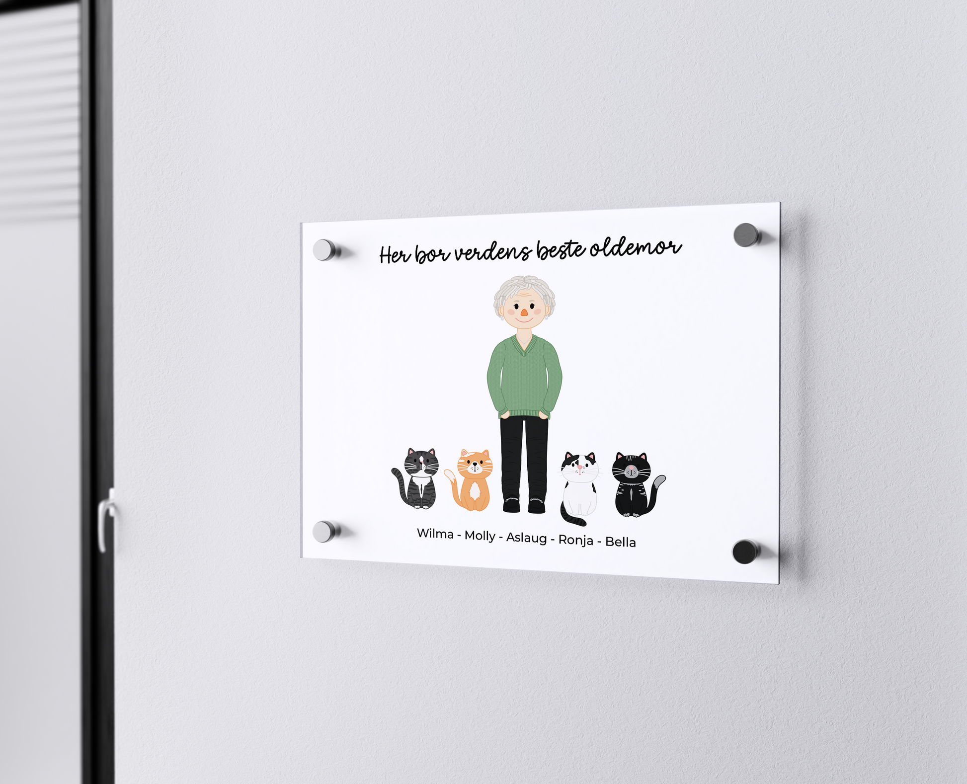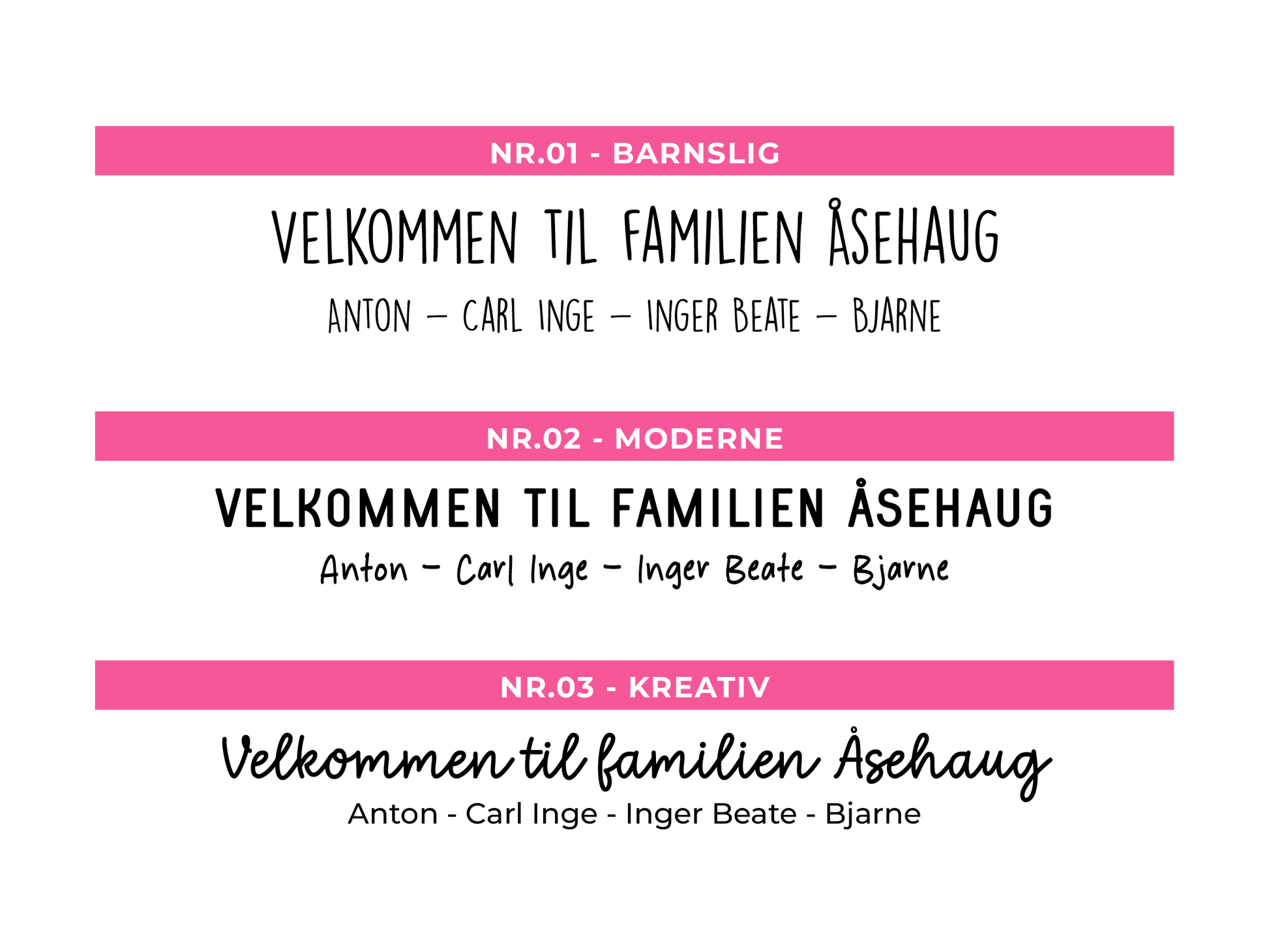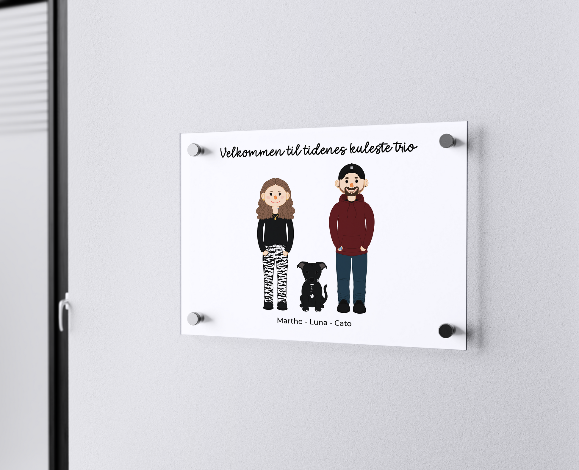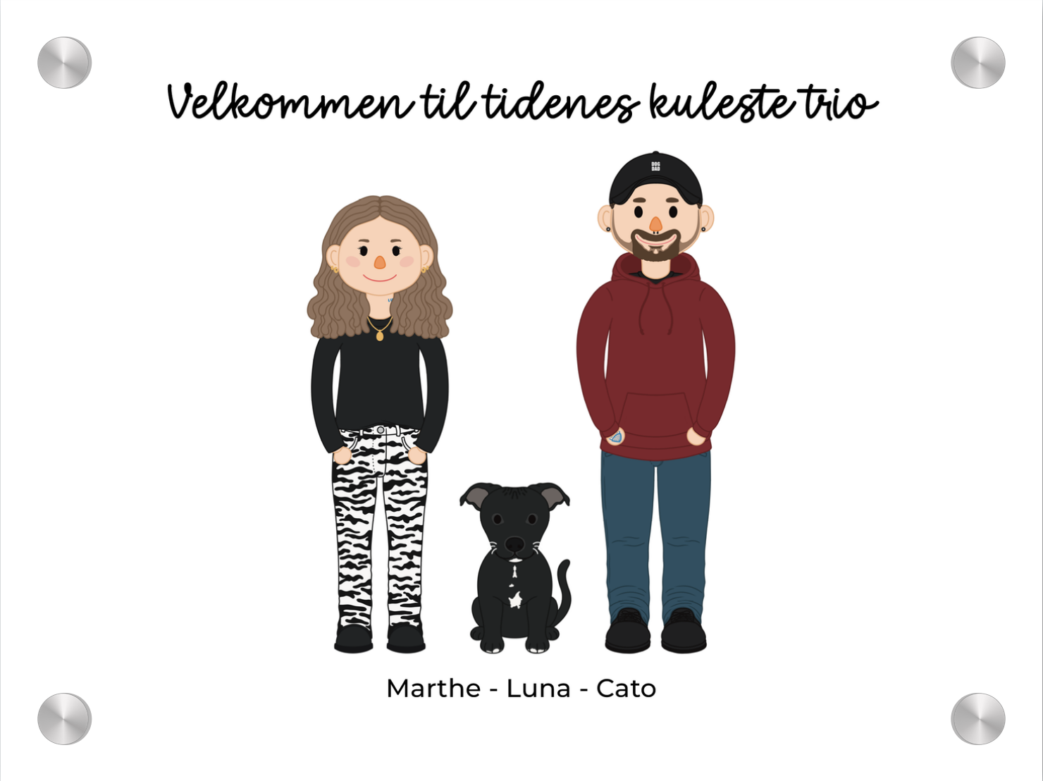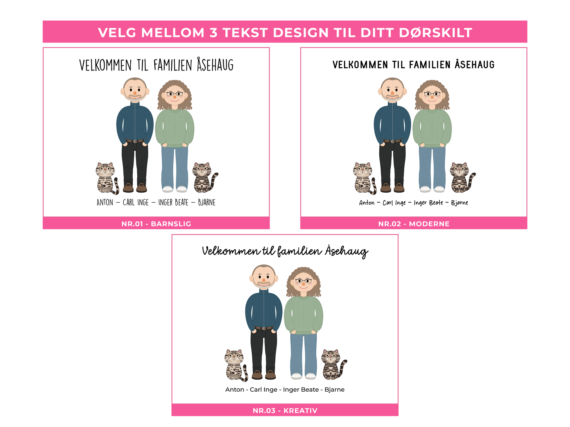 Legg ved et bilde av hver karakter som skal tegnes, samt kort beskrivelse. Velg hvilket veggfeste du ønsker, hvor mange karakterer, kjæledyr og nyfødte du ønsker på ditt dørskilt.