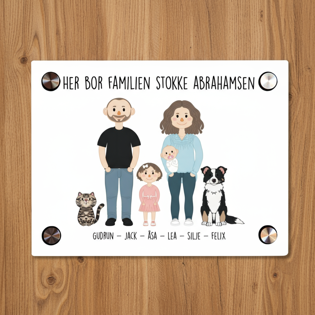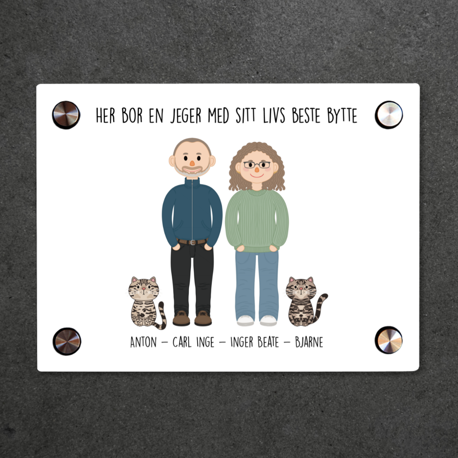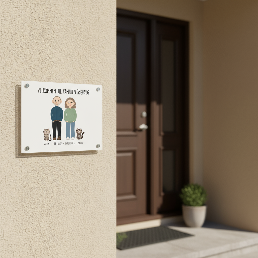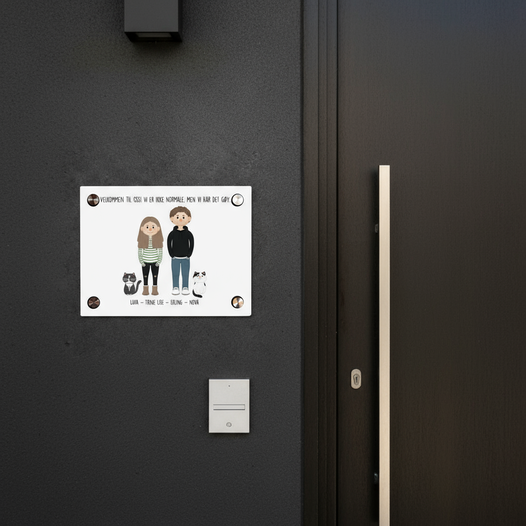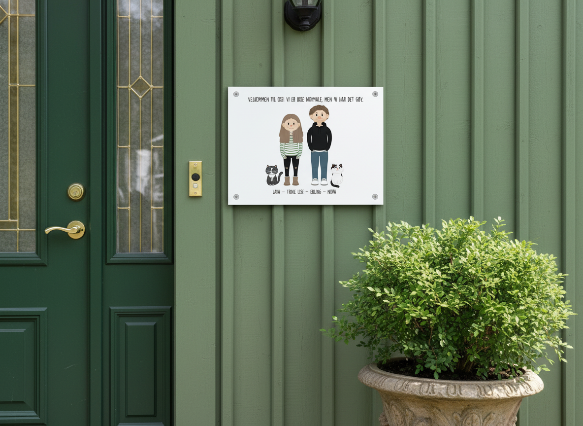 Personlig dørskilt er et nytt produkt og kommer i størrelsen 15x20cm, printet på aluminiumsplate. Stilig og moderne dørskilt som du selv kan vær med på å forme med valg av karakterer, farger og tekst. Håndtegnet karakterer i en morsom stil som representerer mennneskene som bor i boligen.
