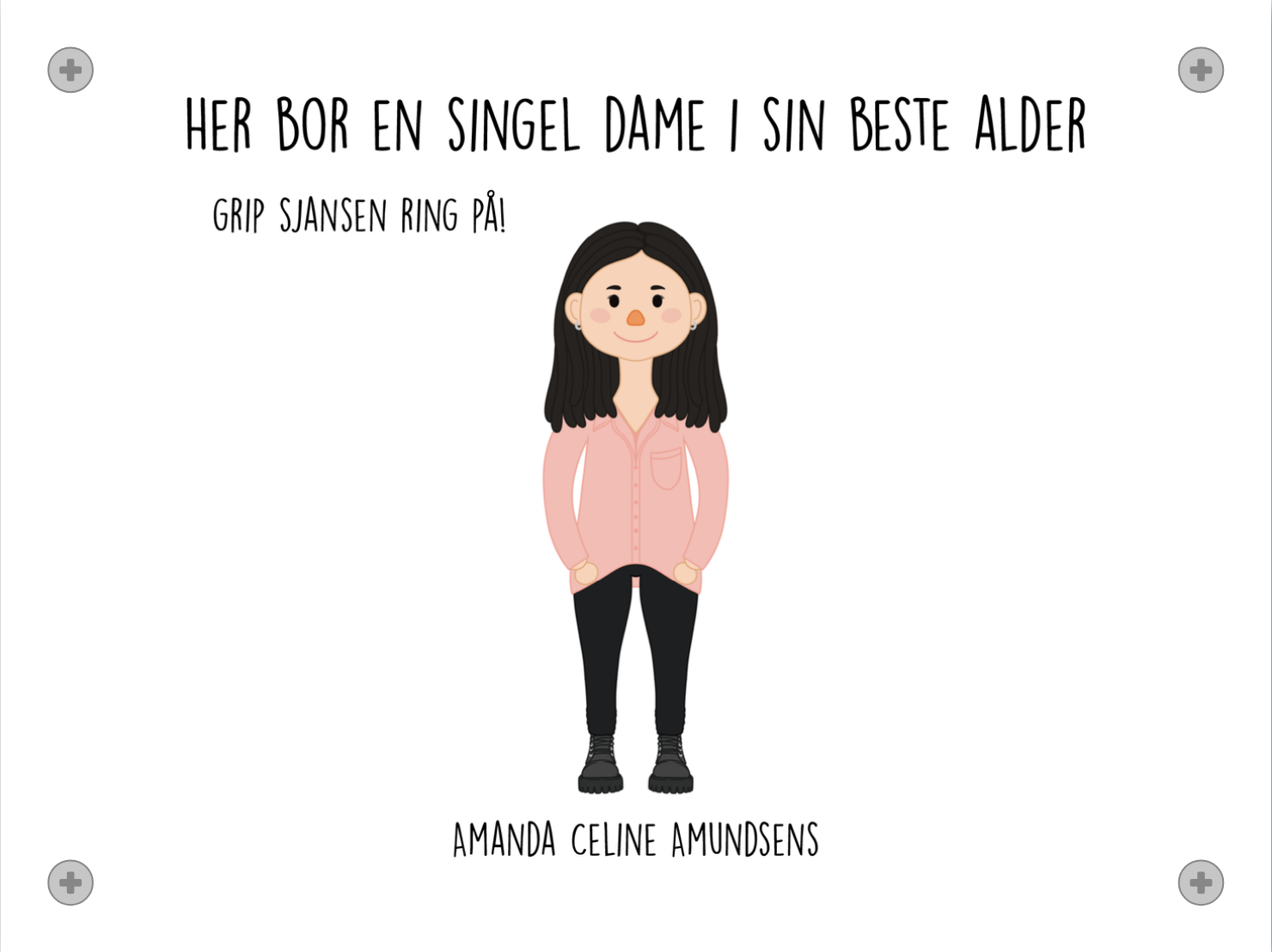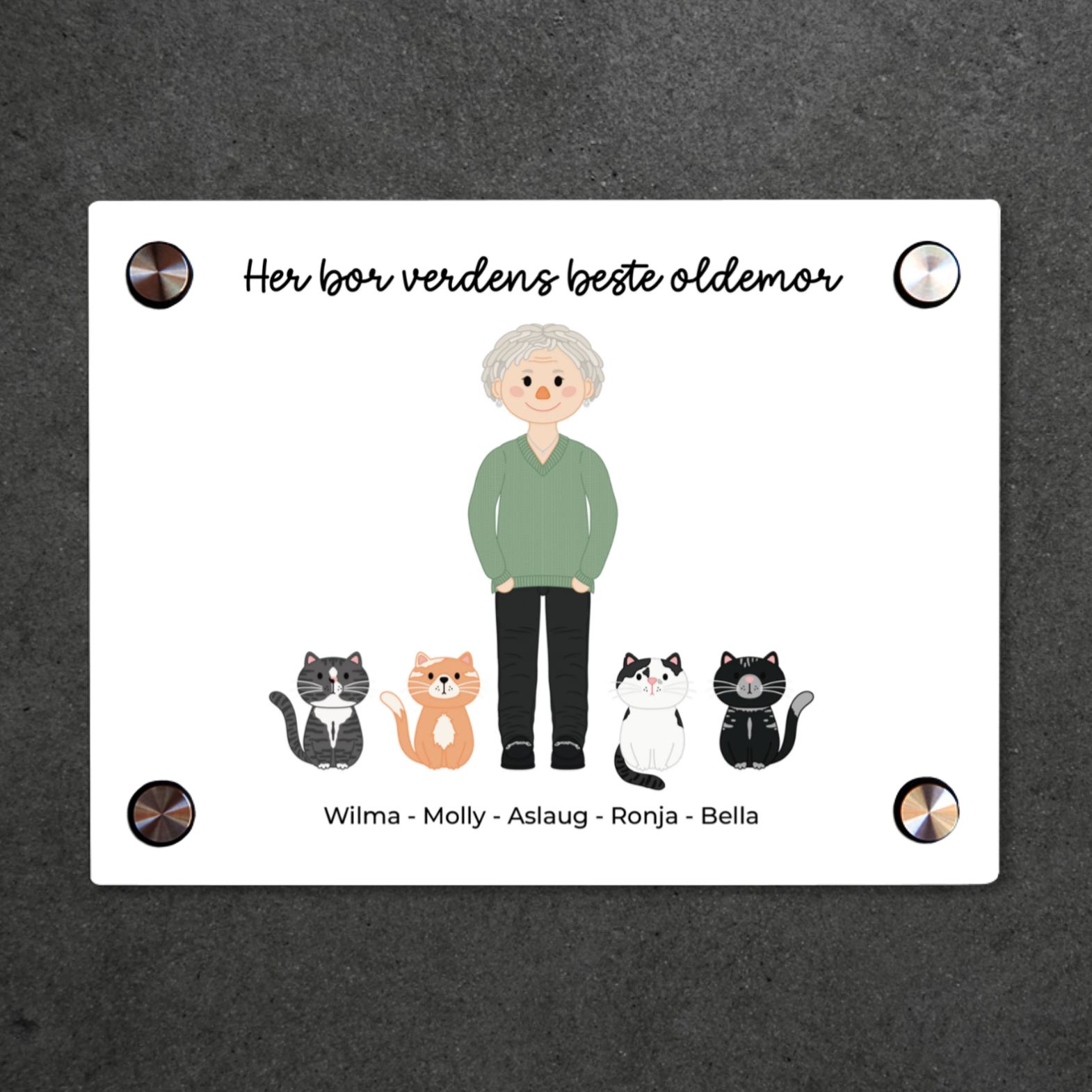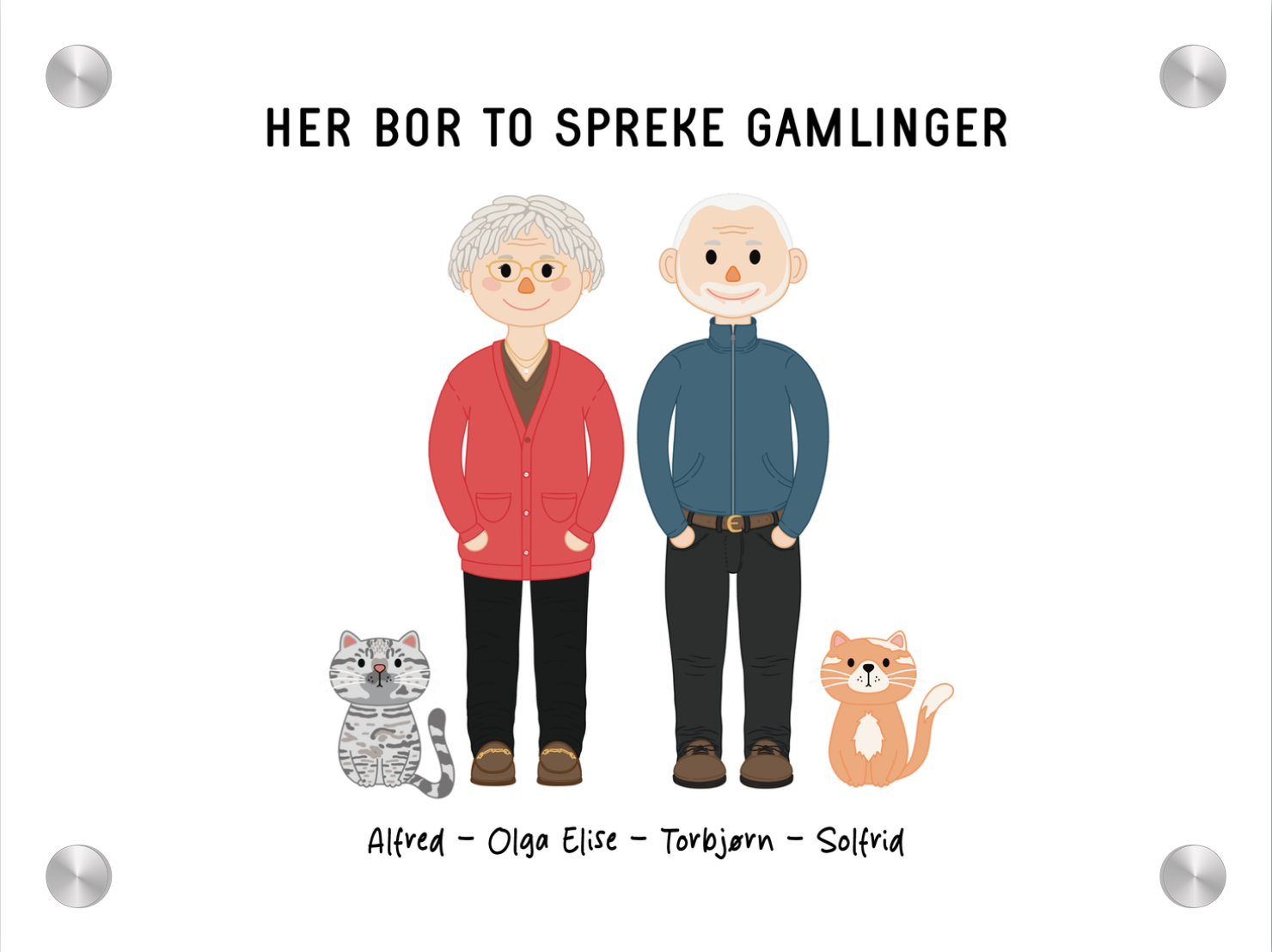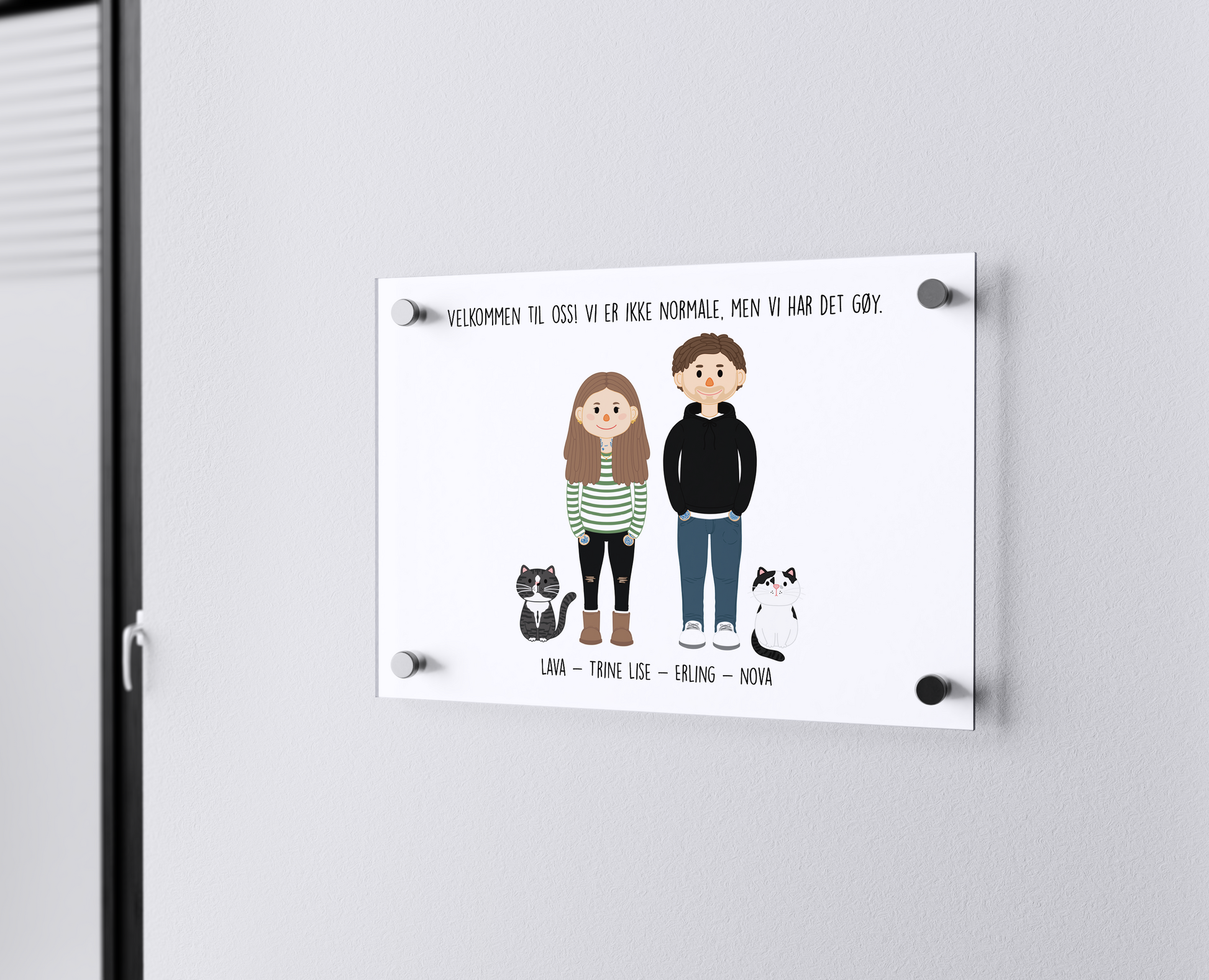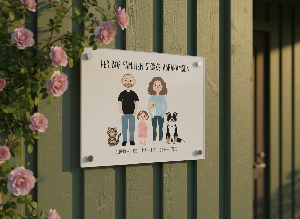 Personlig dørskilt er et nytt produkt og kommer i størrelsen 15x20cm, printet på aluminiumsplate. Stilig og moderne dørskilt som du selv kan vær med på å forme med valg av karakterer, farger og tekst. Håndtegnet karakterer i en morsom stil som representerer mennneskene som bor i boligen.