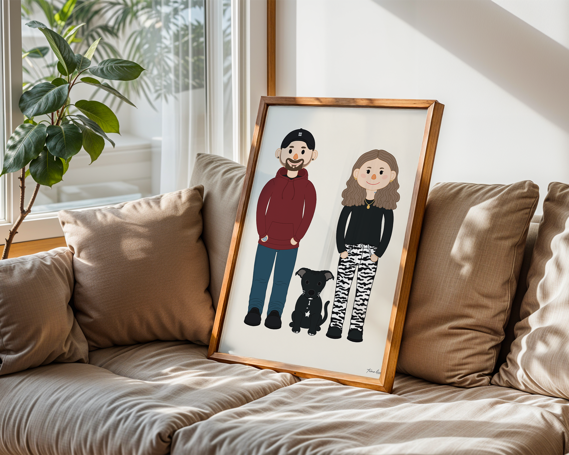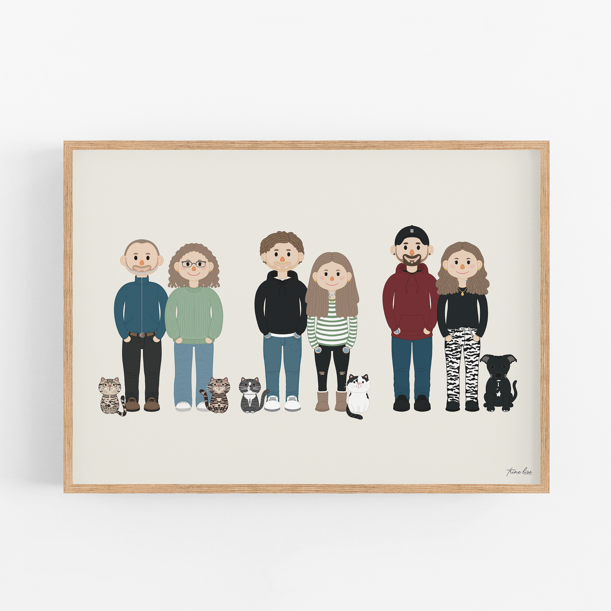 Familie portrett er et nytt produkt, stilig og moderne som du selv kan vær med på å forme med valg av karakterer, farger og størrelse. Håndtegnet karakterer i en morsom stil som representerer familie.