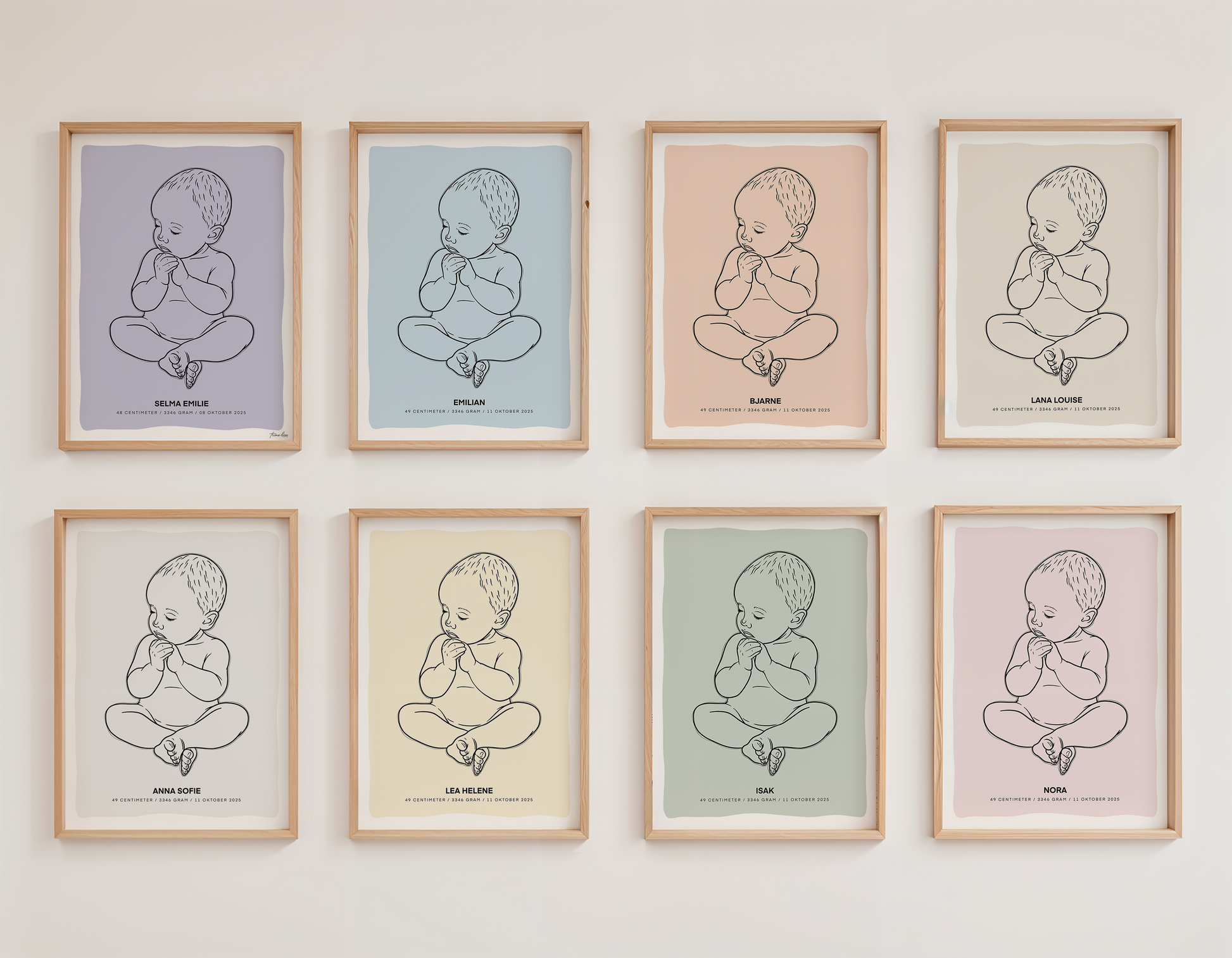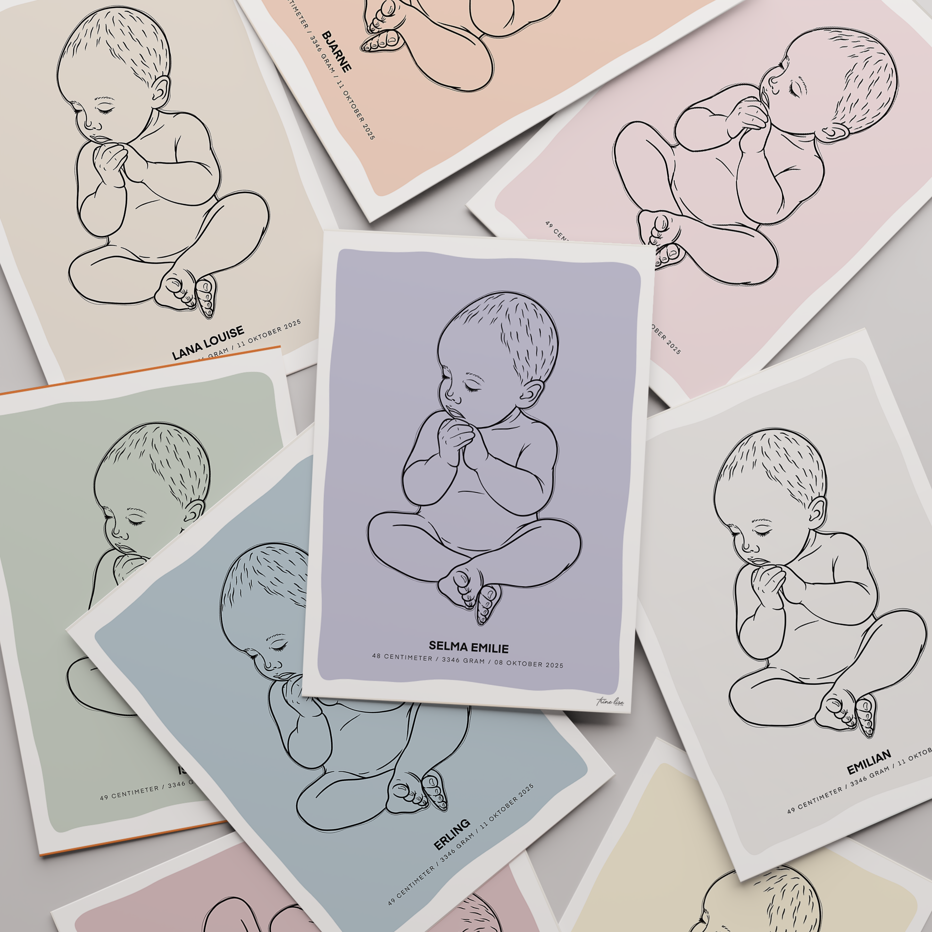 Fødselsplakaten inkluderer navn, fødselsdato, vekt og lengde. Velg fargen som passer best til din bestilling ut i fra vedlagt fargepallett.