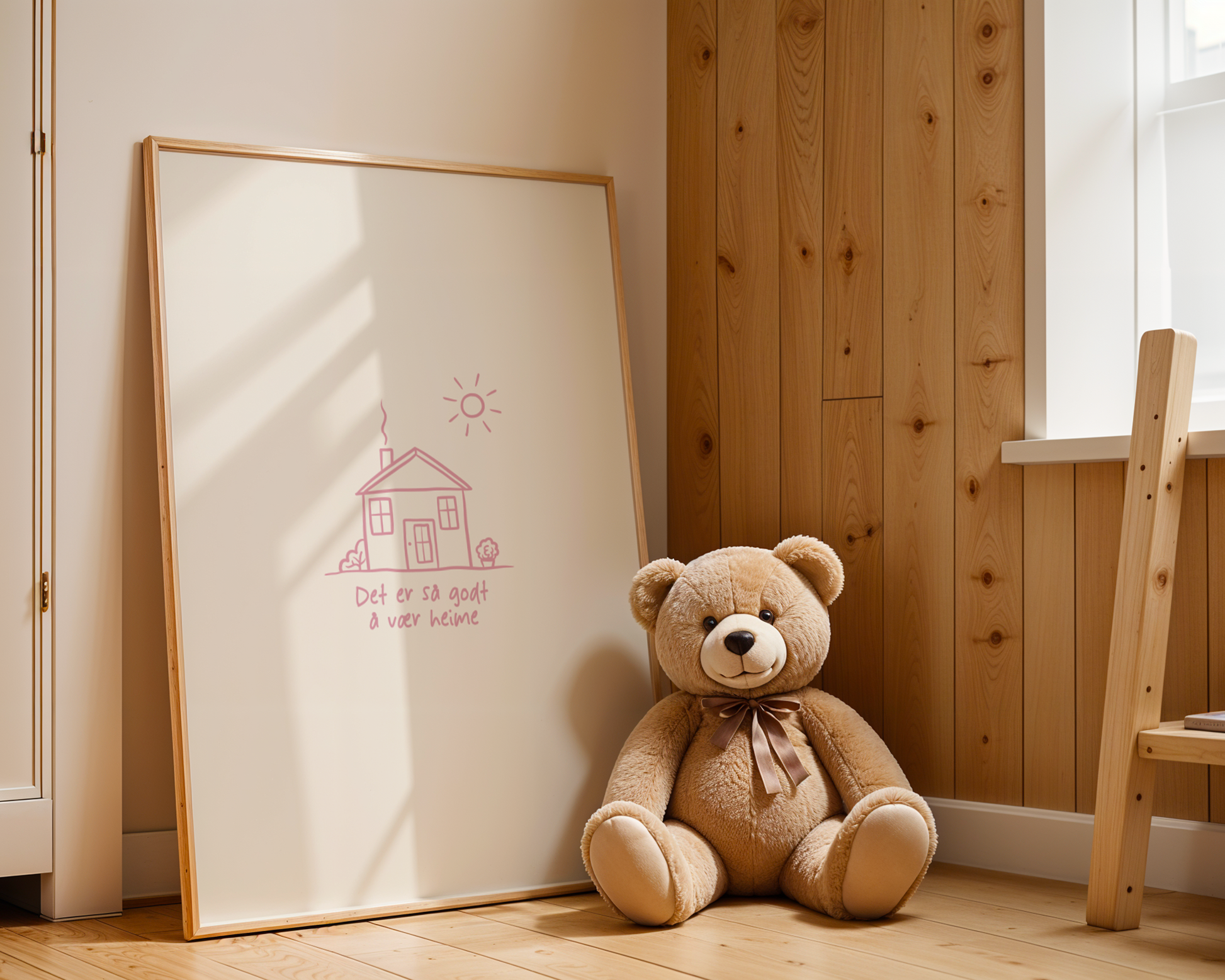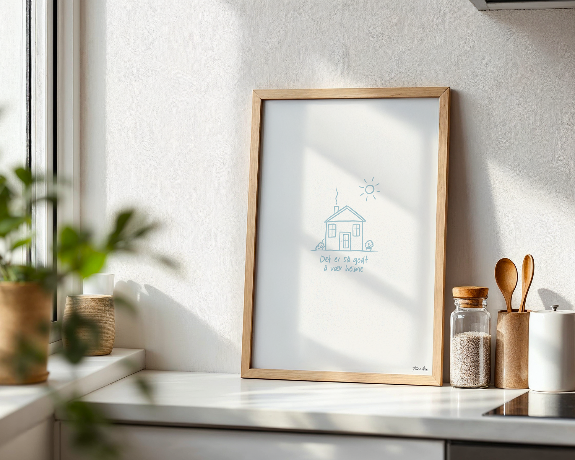 Heime er en minimalistisk plakat med lys beige bakgrunn. Enkel illustrasjon av et hus og et koselig sitat. Den kommer i tre ulike farger.