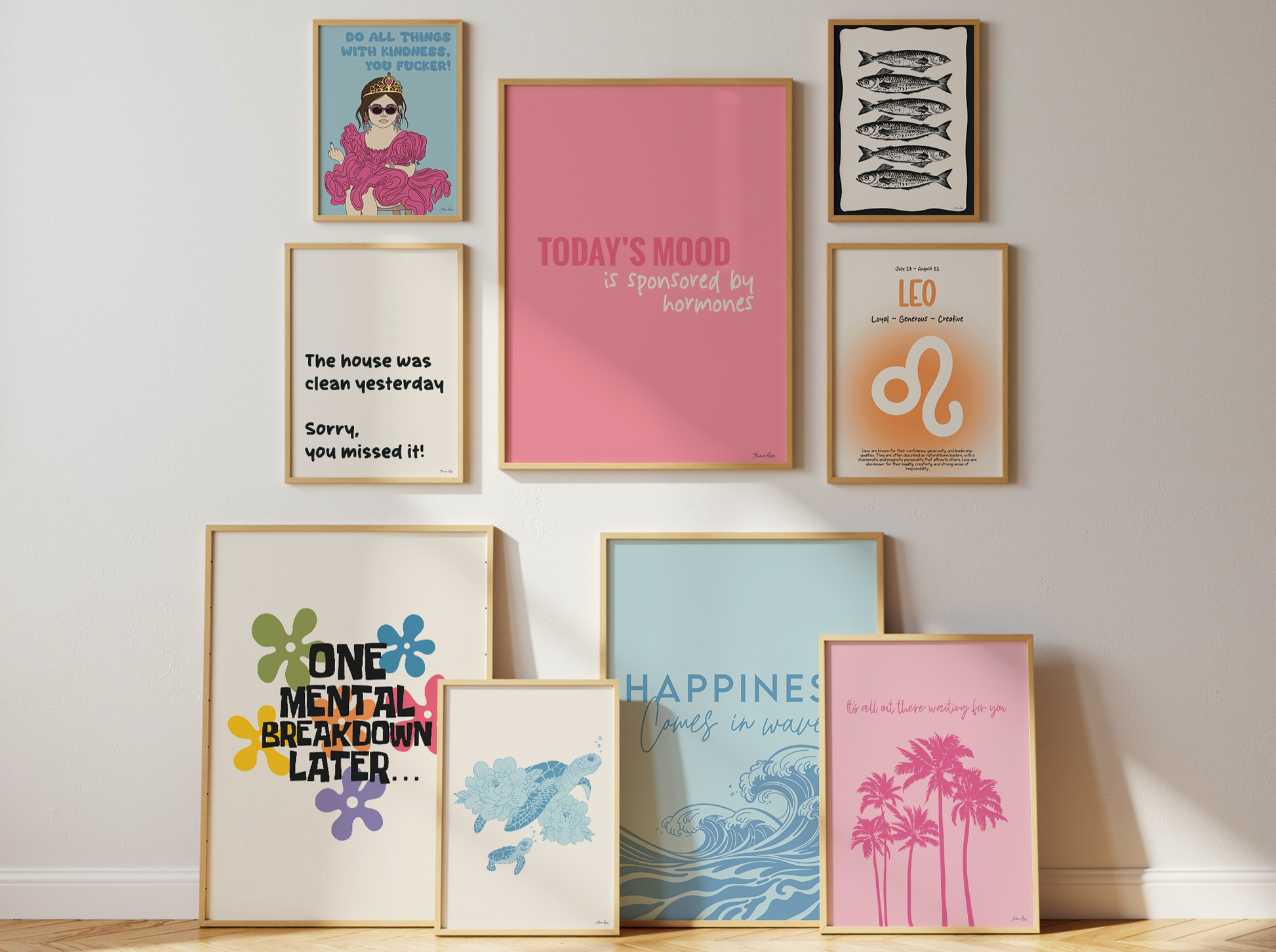 Kunsttrykkene skapes digitalt på Ipad for og så trykkes på matt fotopapir i 180g tykkelse.