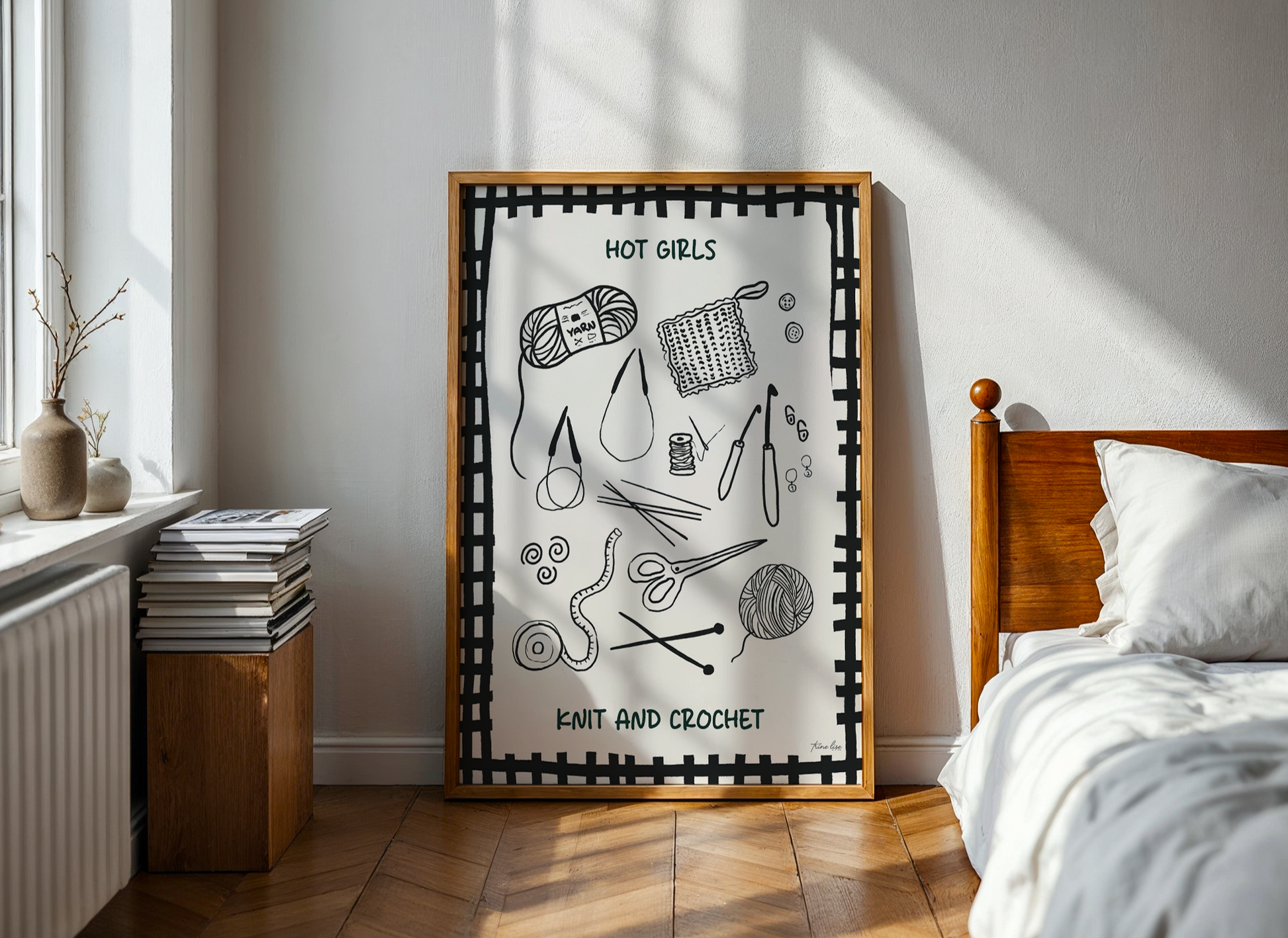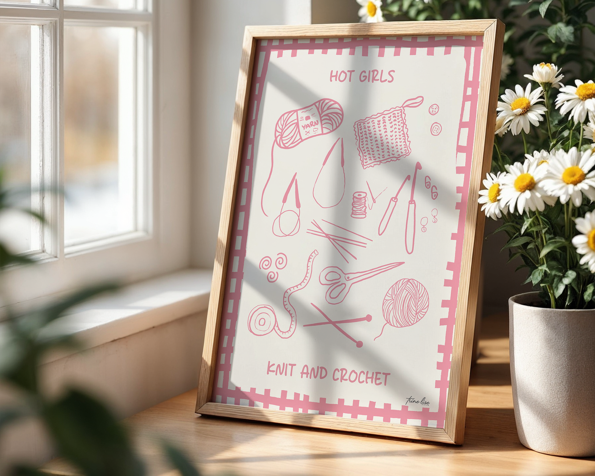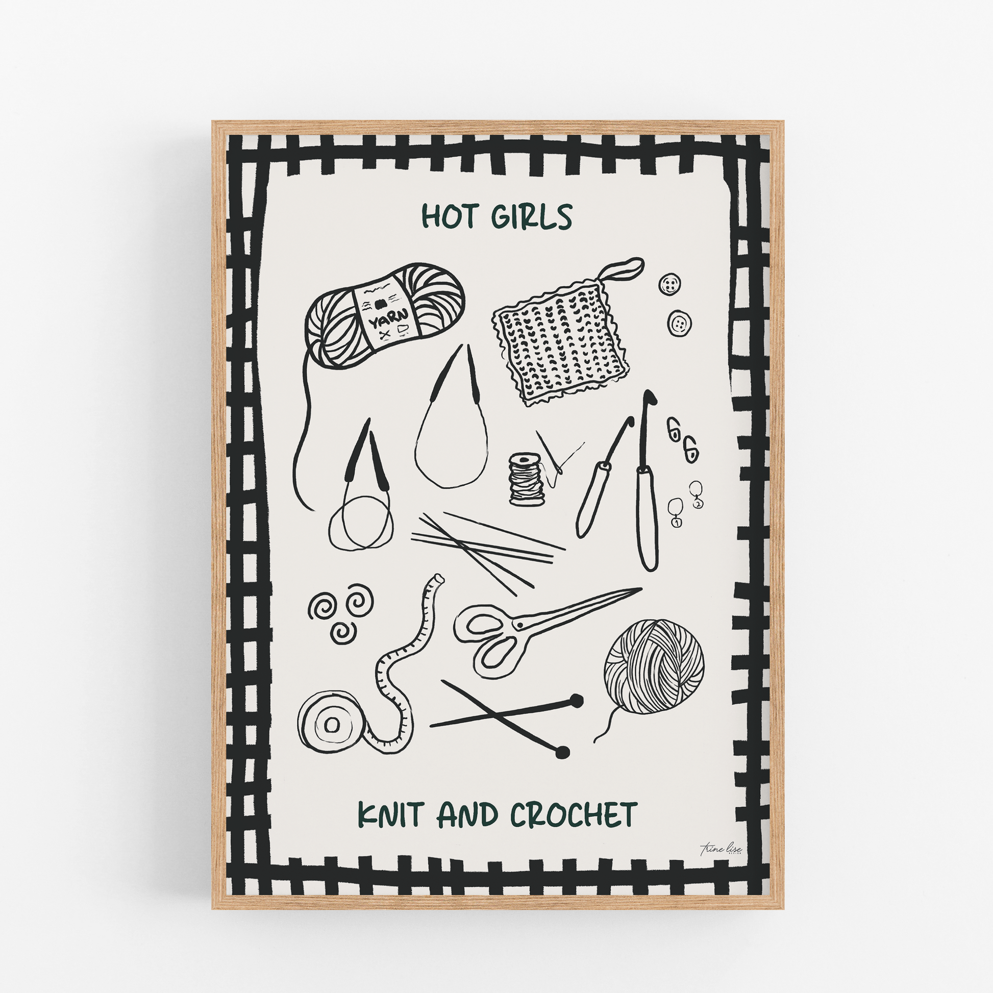 Hot girls knit & crochet er inspirert av jenter som håndarbeid. En plakat til veggen din hjemme med illustrasjoner av strikke og hekle utstyr. Den kommer i to ulike farge varianter svart og rosa.