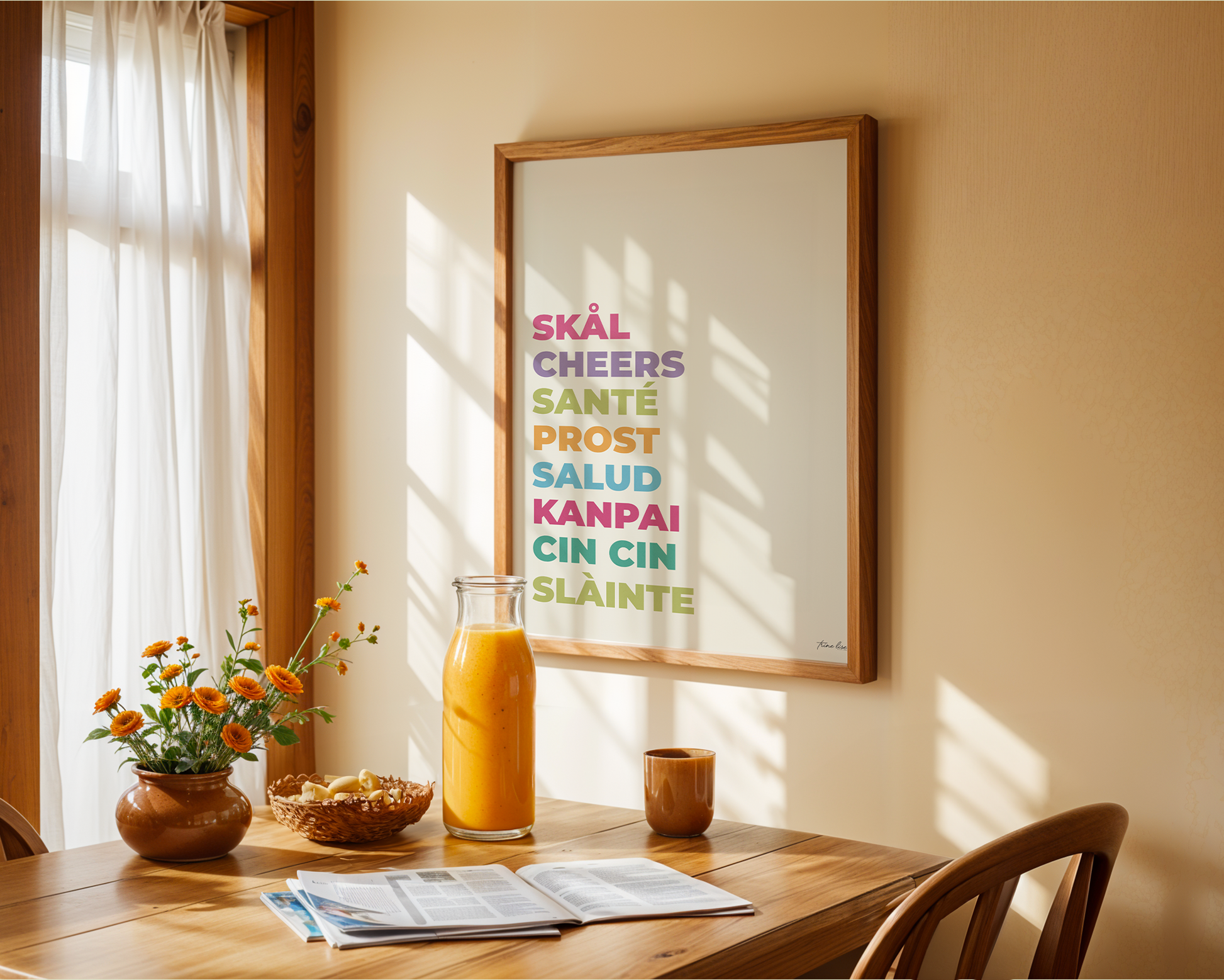 Salud er inspirert av fest og feiring, en tekstplakat med ordet "skål" visualisert i ulike språk fra rundt om i verden. Plakaten har lys beige bakgrunn og fargerik tekst.